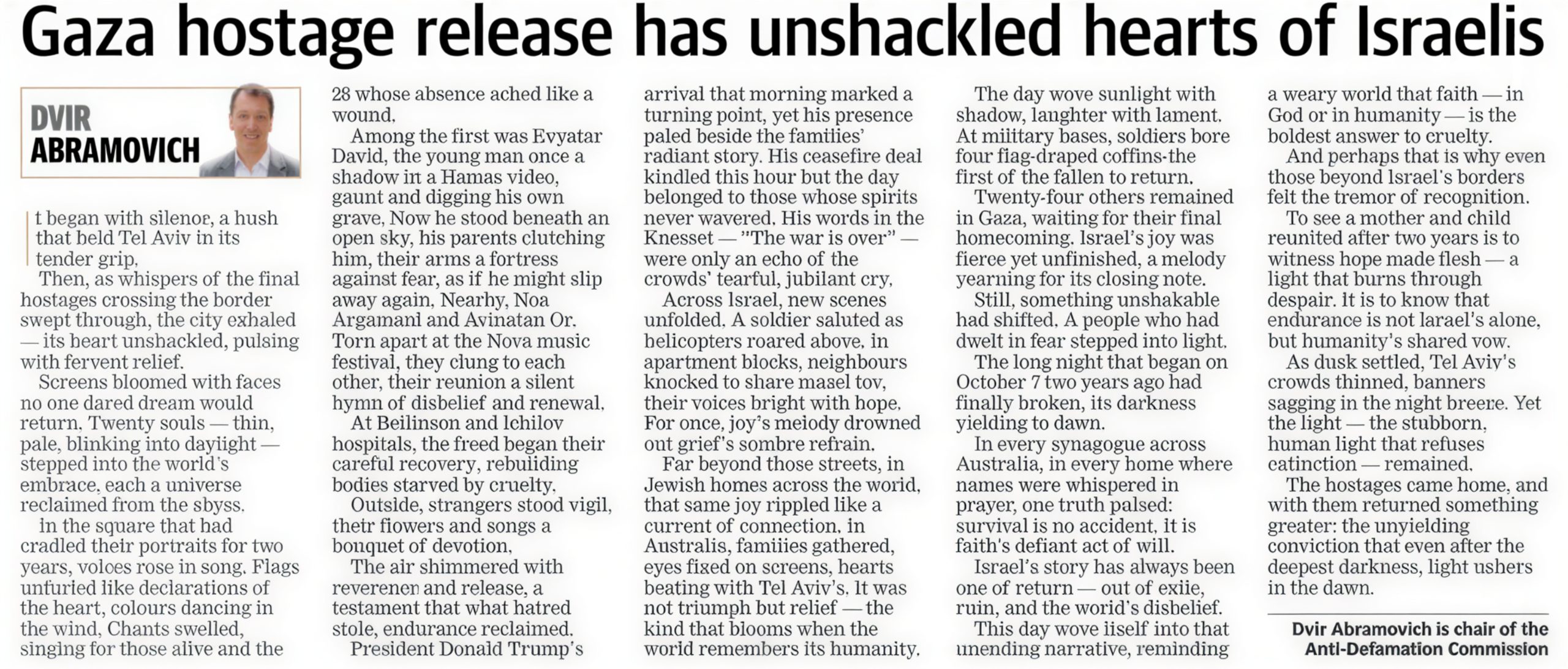 Dvir writes an op-ed for Herald Sun about the release of the hostages