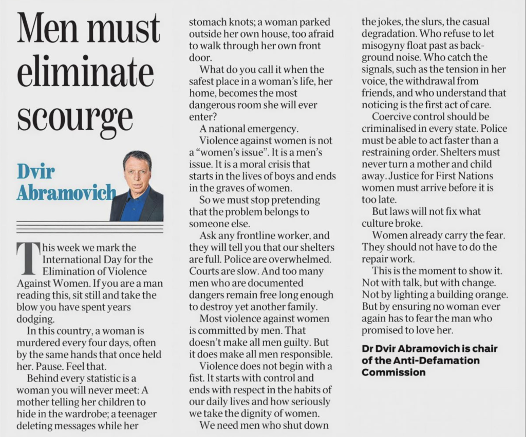 Dvir writes an op-ed about the International Day to Eliminate Violence Against Women