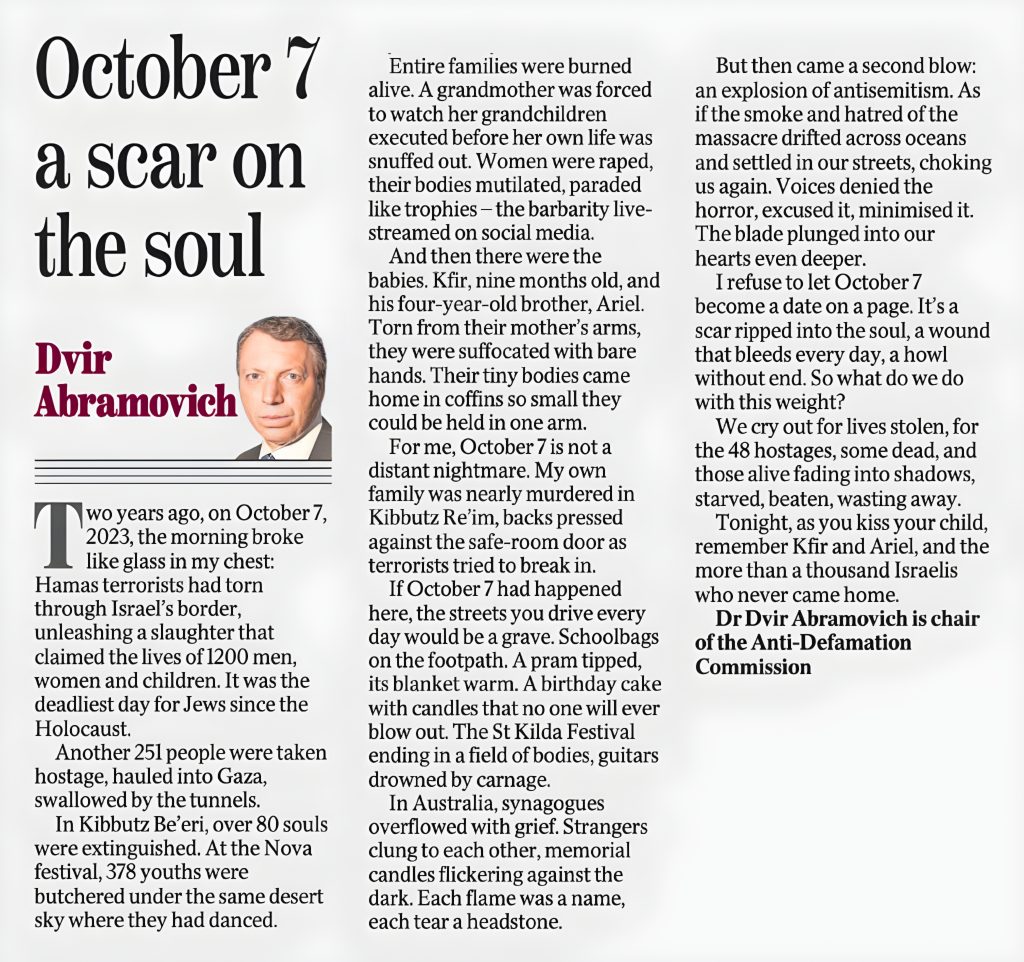 Dvir writes an op-ed for the Herald Sun about October 7 two years later